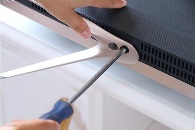 说完开箱,小编带大家再来看一下如何安装。安装还是比较简单的,只要将两个金属支架卡入电视底部的凹槽内,用螺丝固定即可。而且厂商还很贴心的在底座上面还有 L-R(左右)的标识。在底座的支脚上,还设计了橡胶垫,这样设计可以防滑,让电视摆放更加平稳。