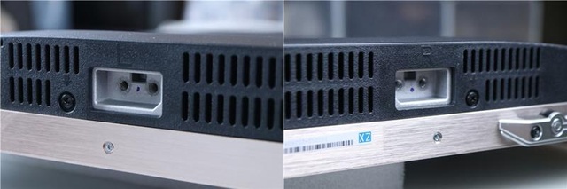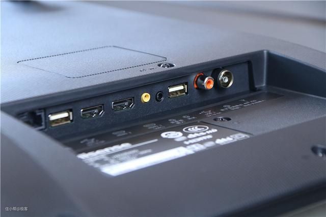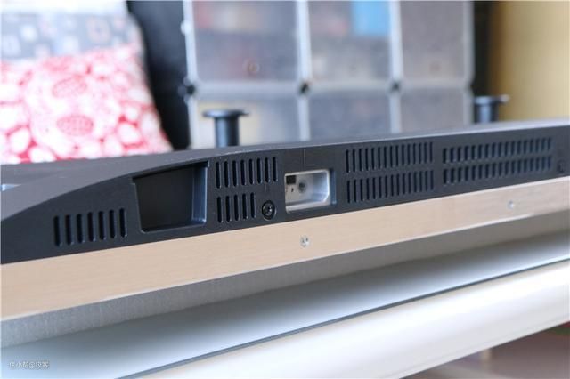而在下方较厚的位置是屏蔽罩,为塑料材质,在屏蔽罩的上方,则是散热孔的位置,外放音腔则被设计在了底部位置,也就是支架安装的位置。这样的设计应该是保证电视内部的热量及时挥发出去,稳定运行。此外在屏蔽罩上面,还配置了两个把手,便于搬运,这点设计比较贴心。