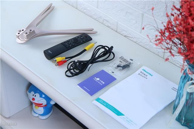 除主机外,还有一对鲸鱼型金属支架,一个支持语音功能的遥控器,一条音视频转接线,一条电源线和四颗螺丝,而四颗螺丝则是用来安装底座的,此外相关的说明书等资料也是少不了的。