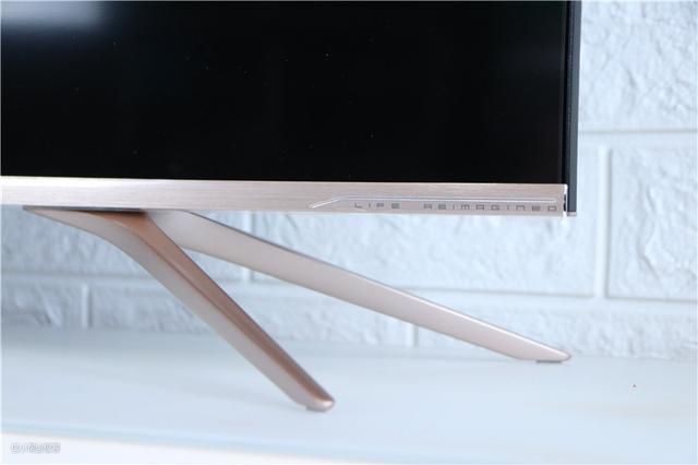 而在它下边框的左侧,这里就是电视的电源开关以及遥控器接收窗的位置。趴在上面仔细了看一下,略突出的位置上面,还设计了四个圆形小孔,这个呢也就是我们常说的拾音孔,用来接受语音信号的。而在下边框右侧位置,仅标注了life reimrgineo的英文标识,整体设计简洁、大方,这样的设计小编还是很喜欢的。