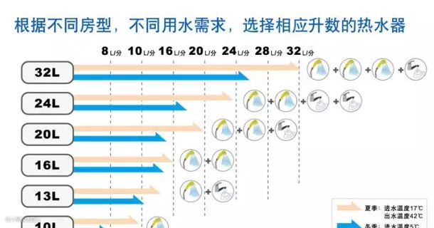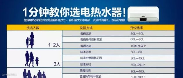 水压不够、没有地方放置燃气热水器,储水式电热水器是更大众的选择,容量可以参考下图。