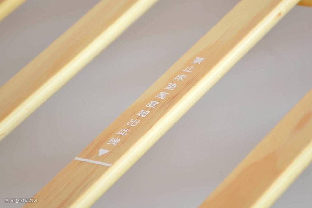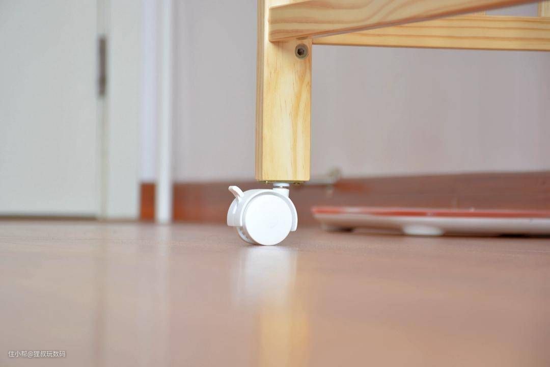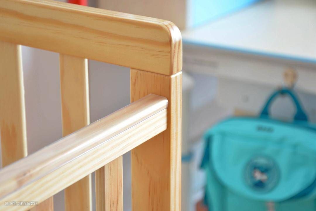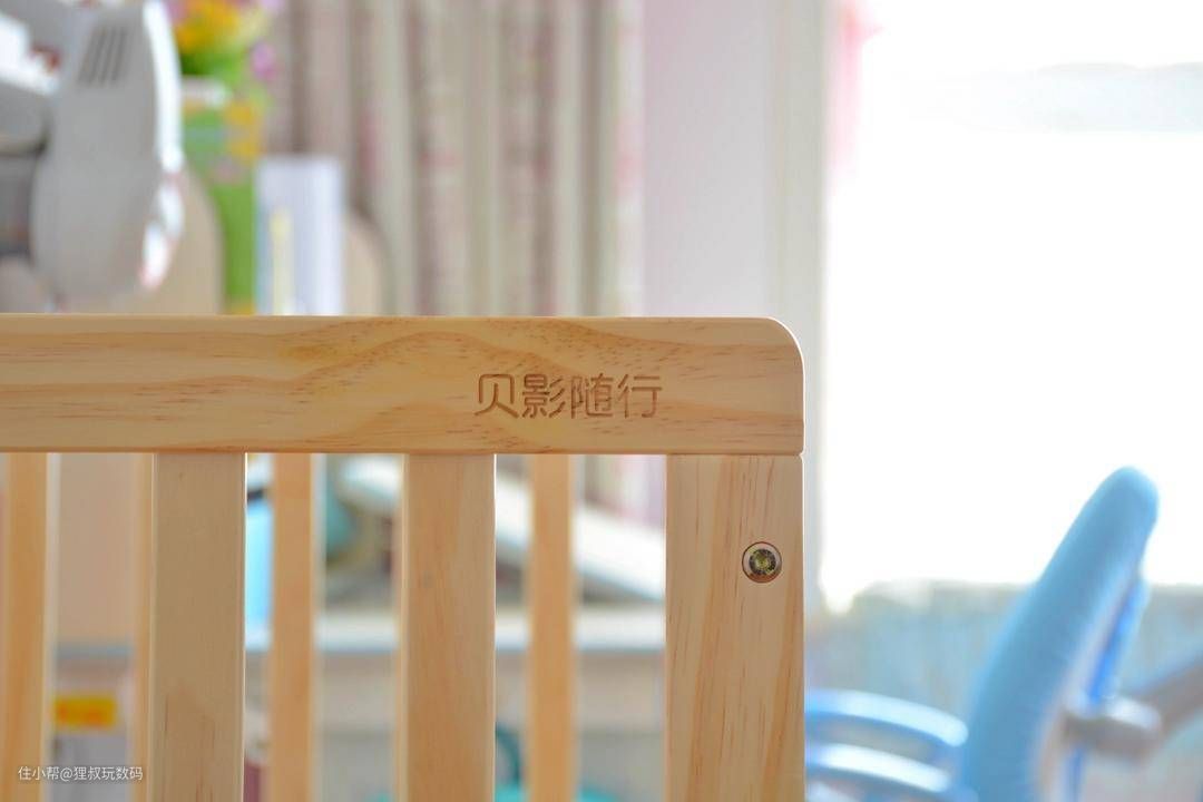 其实刚开始我也担心气味问题,毕竟急用,就算是原木味宝宝闻了也会不舒服,直到拆开后这点担心才解除。看细节,贝影随行这款婴儿床做工非常好,采用了巴西进口松木,通体水性漆包裹,手感圆润光滑没异味,正反面都没有毛刺,彰显工匠精神。床前床后都刻有贝影随行的LOGO,床围两侧顶部都有塑胶加持,一侧还印有“禁止床垫高度超出此线”字样。底部的四个自刹万向轮可以让我们在全屋推行,推行声音比较静,哄孩子睡觉好样的,需要固定时按下刹车非常稳固。