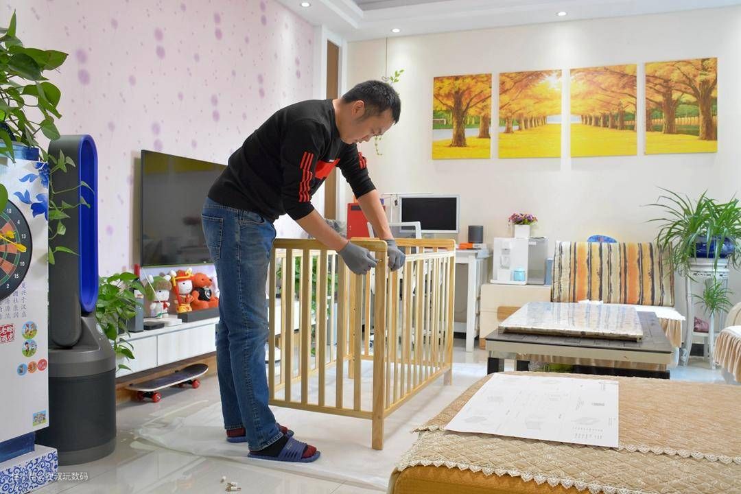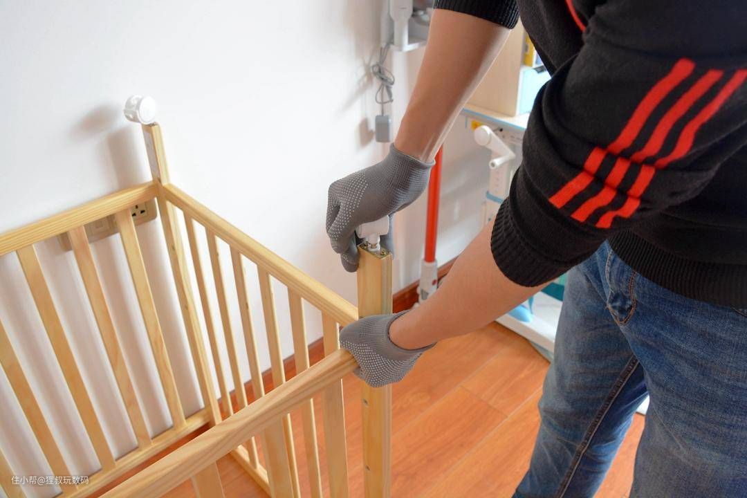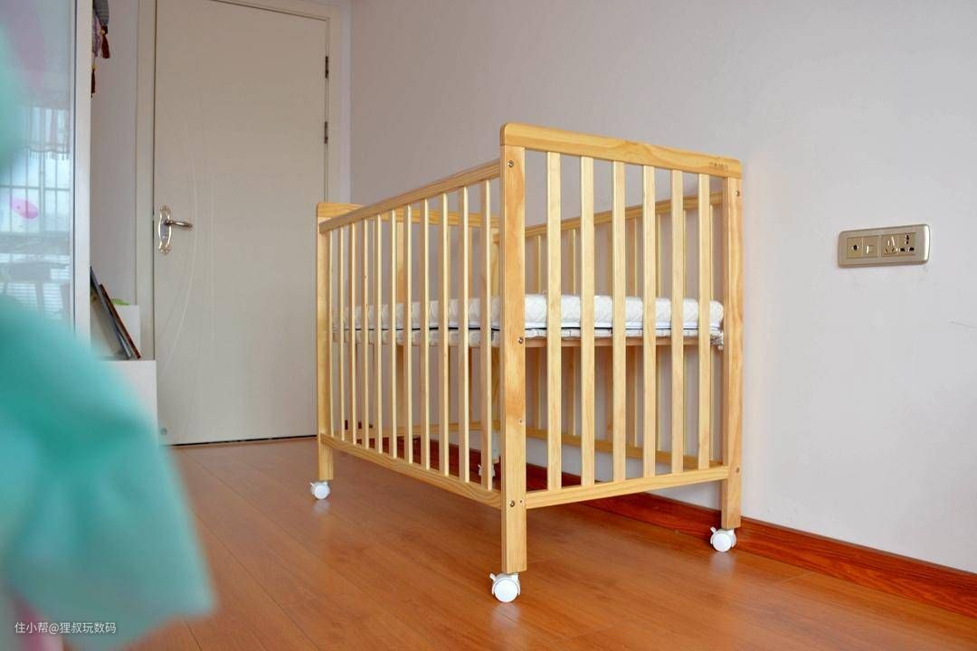 这是装好的样子,看上去是不是特别有感觉,装好后我就给妹妹打电话让她来看了。大家是不是还没发现这款婴儿床的多功能在哪里?首先它支持高中低3档调节,第三档距地面21厘米,方便宝宝在里面扶站学走,每根栏杆间都采用了欧盟安全标准,就算孩子们的小手在每根栏杆间游刃也不会被卡到。然后第二档和第一档分别距离地面36厘米和51厘米,拆掉一边的围栏他就能和大床无缝拼接,就算是家有二宝也能轻松照应。