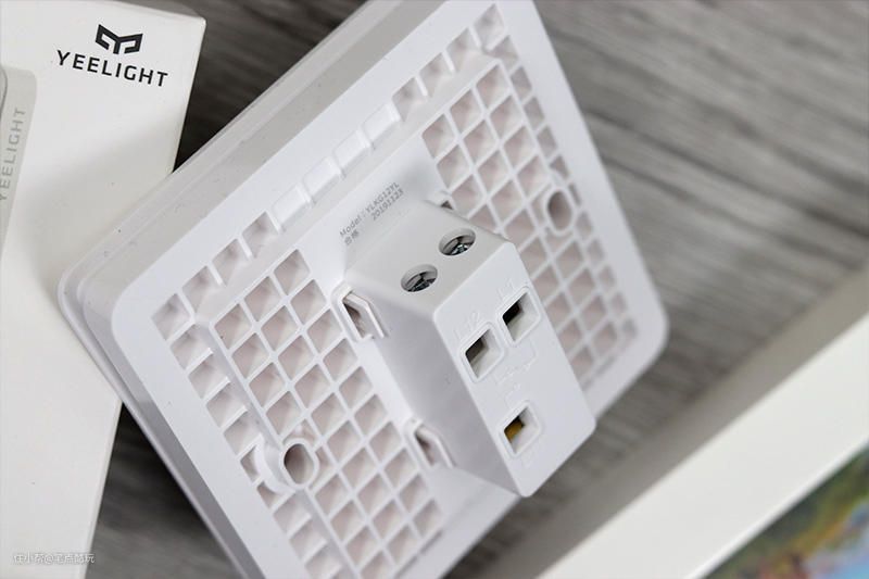 正面类似烤瓷表面,整体采用阻燃PC,防老化同时有韧性,开关长时间“跷跷板”不变形,个人比较欣赏Yeelight凌动开关这种简洁化设计,右下角的贴纸揭掉就完美了,不过请忽略这丑不拉几的墙纸。