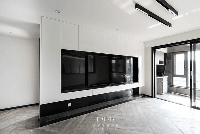 柜子的中间掏空了一部分用来安装电视,长度为3.3m,左右两边各留了0.4m的宽度,黑色的墙面和电视颜色融为一体,整体感比较强,电视摆放在中间也不会显得突兀。