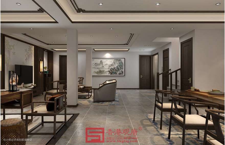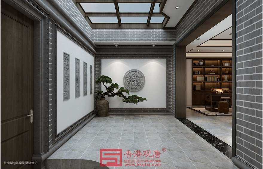 龙山希思庄园别墅新中式风格,户型为双拼别墅,面积为395㎡。业主对中国传统文化情有独钟,房子养老用,要求中堂,喜欢砖雕,在地下室入户的空间可以看到。
