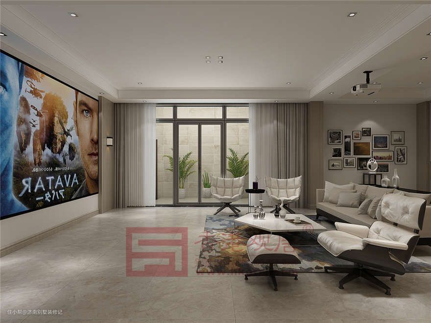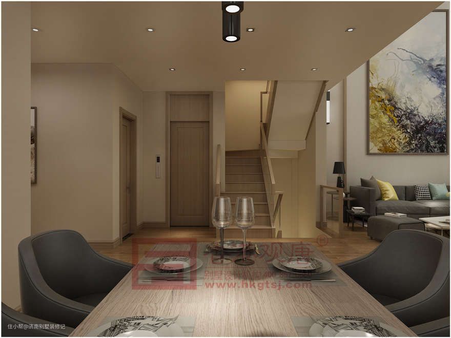 龙山希思庄园别墅现代简约风格,为双拼别墅,业主喜欢断、舍、离的文化,所以整体空间都比较自由、简单。