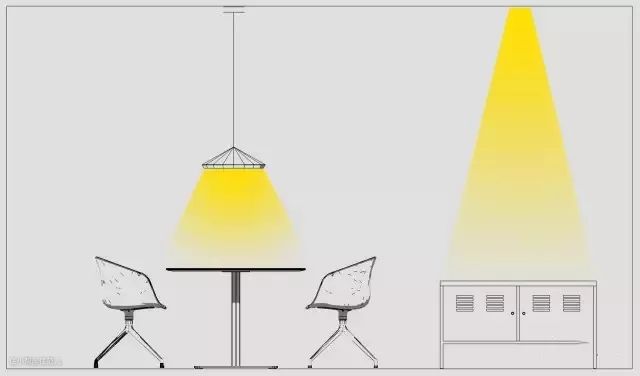 后一盏灯就属于“氛围灯”,因为它照亮了餐桌周围的环境,当人眼从餐桌转向别处时,有从亮到暗的一个舒适过度,而不是“餐桌极亮周围极暗”的强烈对比。