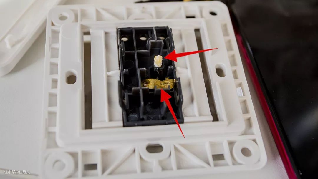 按键通过拨杆,和插座主体连接。较好的拨杆,会用自润滑材料;节省的厂家,会在拨杆上涂抹润滑剂来代替。