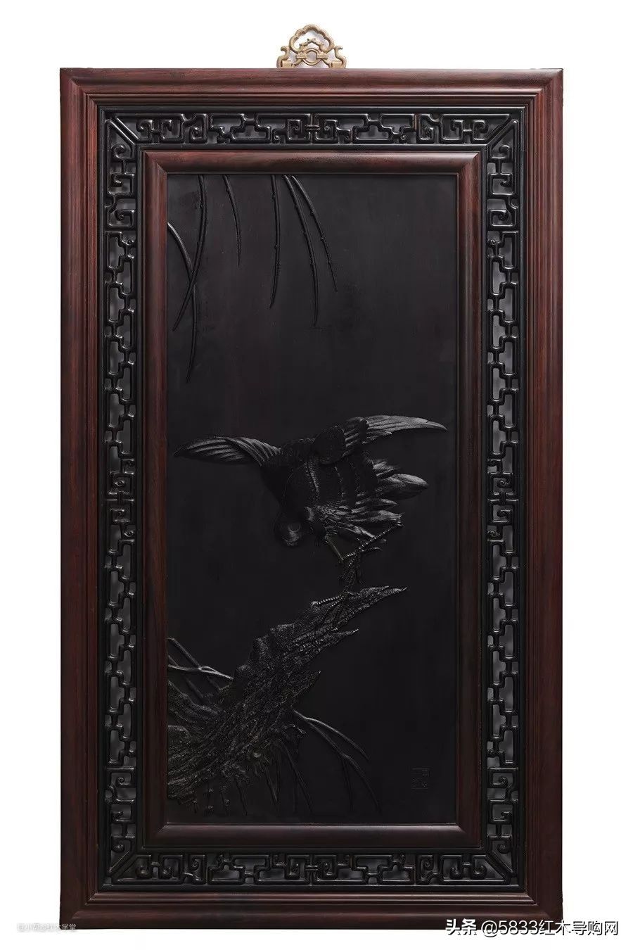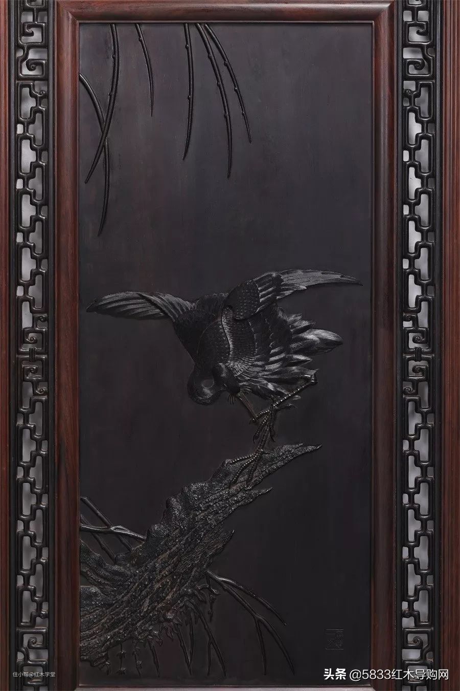 此扇挂屏中屏大叶紫檀,外框大红酸枝,采用丝翎檀雕手法,主图为《雪晴鹭憩图》作品的亮点在于对鹭羽毛和树枝细节的刻划,创作者以刀代笔,颇具传统工笔画的神髓。