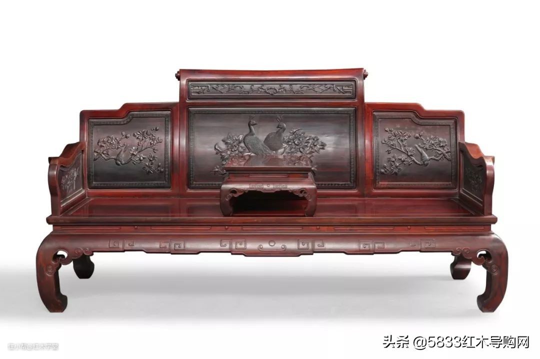 大红酸枝嵌大叶紫檀花鸟纹卷书式沙发