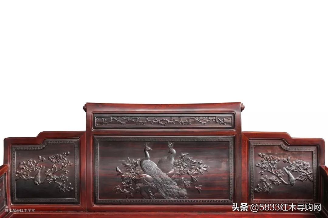 相信眼尖的看官们已经看出来了,这套沙发是由大红酸枝与大叶紫檀相互搭配而成,此套红木沙发宝座的靠背板面心均是大叶紫檀(卢氏黑黄檀),大红酸枝与大叶紫檀搭配得来是因为大叶紫檀整体颜色较醇厚,偏深色,纹理流畅,与大红酸枝的颜色木纹搭配起来整体较为和谐,而且不同于小叶紫檀与黄花梨搭配的鲜明对比,从上图就可以看出,大红酸枝为框,面心板为大叶紫檀,其中雕纹就显得突出,而且由于大红酸枝较为鲜红的色泽与大叶紫檀较深色泽更容易让眼睛的焦点去关注,而面心板突浮雕的纹理则会在两种红木色泽混合的影响下变得更为和谐,不会显得突兀,整体就显得更为神秘尊贵,这算是红木家具中非满彻家具中较为高级的搭配。