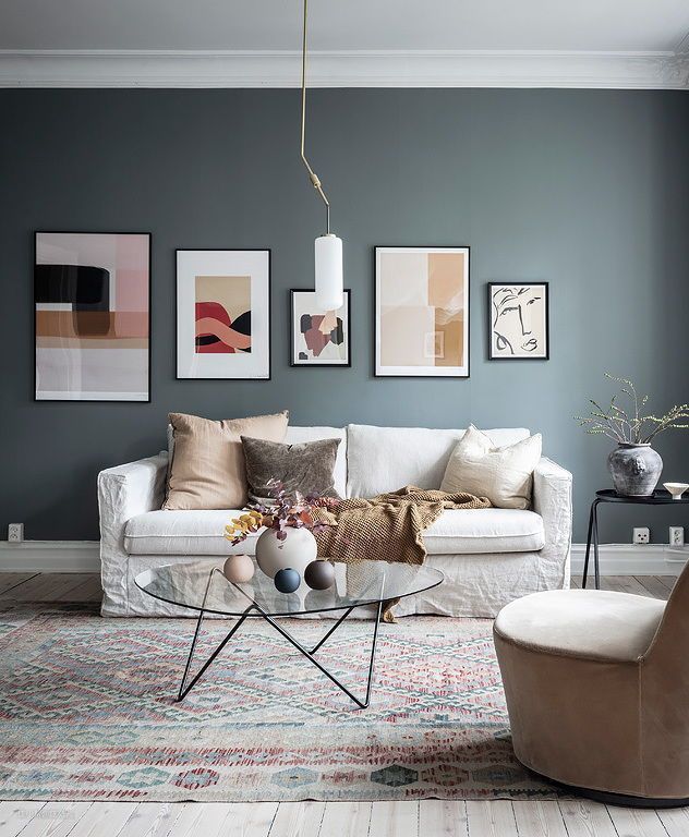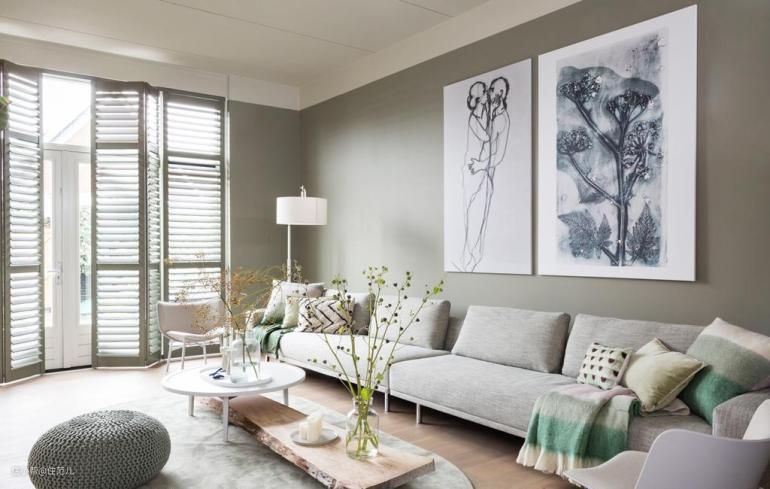 这个案例是较浅的绿灰色,只有淡淡的绿色倾向。烟灰色沙发、地毯和背景之间的色差也很小。