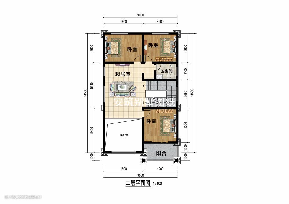 别墅二层三间卧室的设计能够满足家人们的居住需求,下方卧室还带有阳台的设计让室内光线充足。