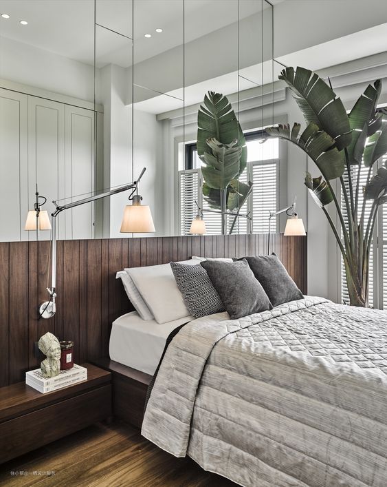 镜面加木板的组合,搭配起来也别有一番风味。占据不少墙面的镜子造成了视觉上的空间延伸感,显得明亮通透;经典原木元素的运用为房间增添了一分气质美。
