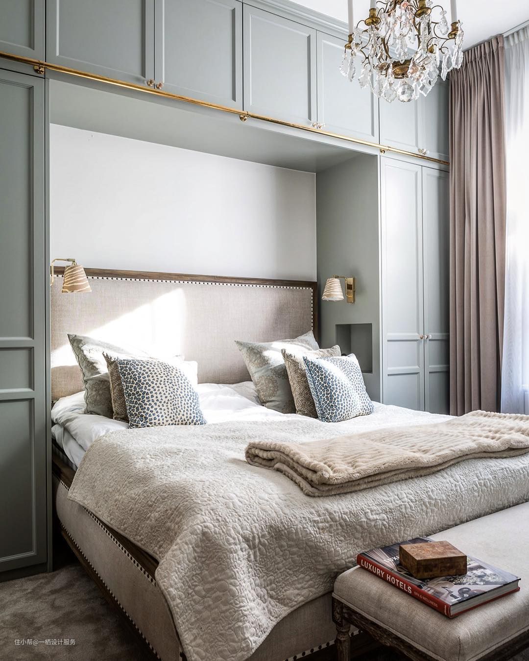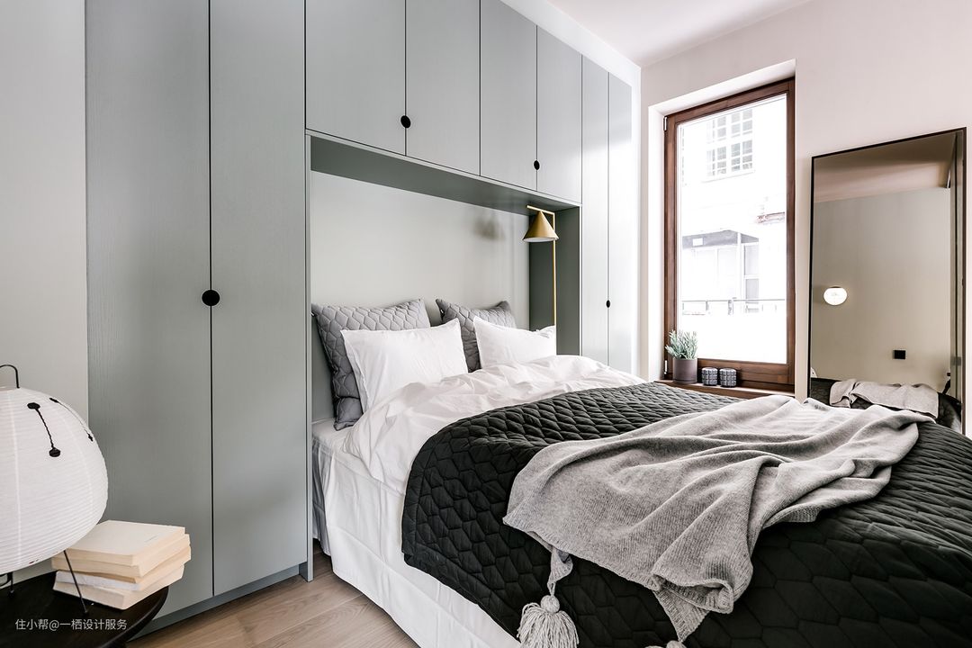 为了提高空间利用率,衣柜也可以融入卧室背景墙之中,在空隙处还可以摆放一盏落地灯,整体看起来融洽度满分。