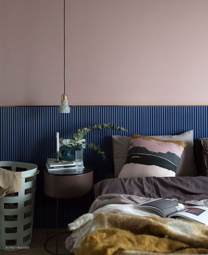 浅粉色加淡蓝色向来是一种让人倍感舒适的色彩搭配,带有细细花纹的蓝色背景墙加上粉色软包,营造了柔和美丽的氛围。