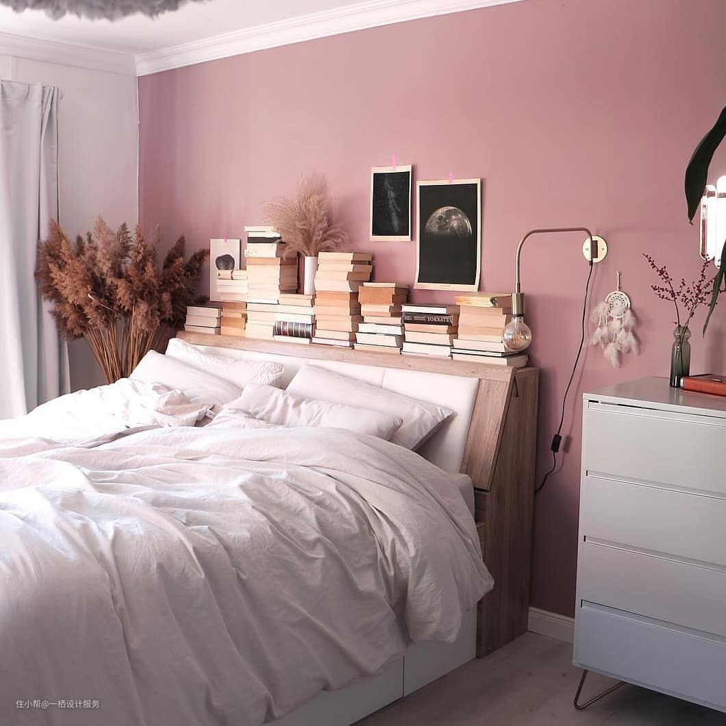 粉色的背景墙充满着浪漫甜美的气息,墙面装饰也应选择与其风格一致的。粘贴画、捕梦网等ins风装饰品时尚又美观。根据床头结构,还可以在上面摆放书籍,增加空间立体感。