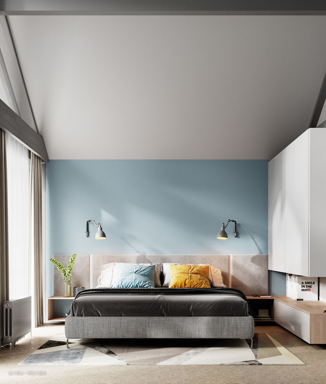 有颜色的卧室背景墙,比单调的大白墙好看了不止一丁半点。选择刷漆有几点注意事项,一是要做好保护工作,油漆沾到其他地方处理起来是比较头疼的;其次在挑选尤其之前要做好功课,最好选择高知名度的无害油漆,并通过正规渠道购买,避免买到掺水或劣质油漆;另外还要选择合适的油漆师傅,刷漆看似简单,实则需要一定的经验和技巧,否则容易刷得不平整,破坏整体美感。