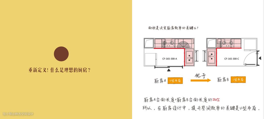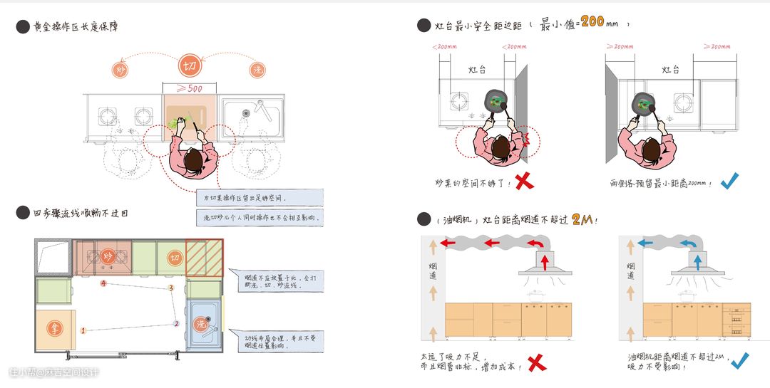 当然,如果是小空间的厨房,还是可以尽量缩小操作空间,400mm左右能放得下砧板为基础预留大小。这里的主旨还是告诉你——如何规划好一个好厨房,并不以实际预留空间长度来标版厨房大小的设置,合理的操作还是介于烹饪、缓冲区、水槽、冰箱(储物)这样一个联动线上。(假设冰箱在厨房内)