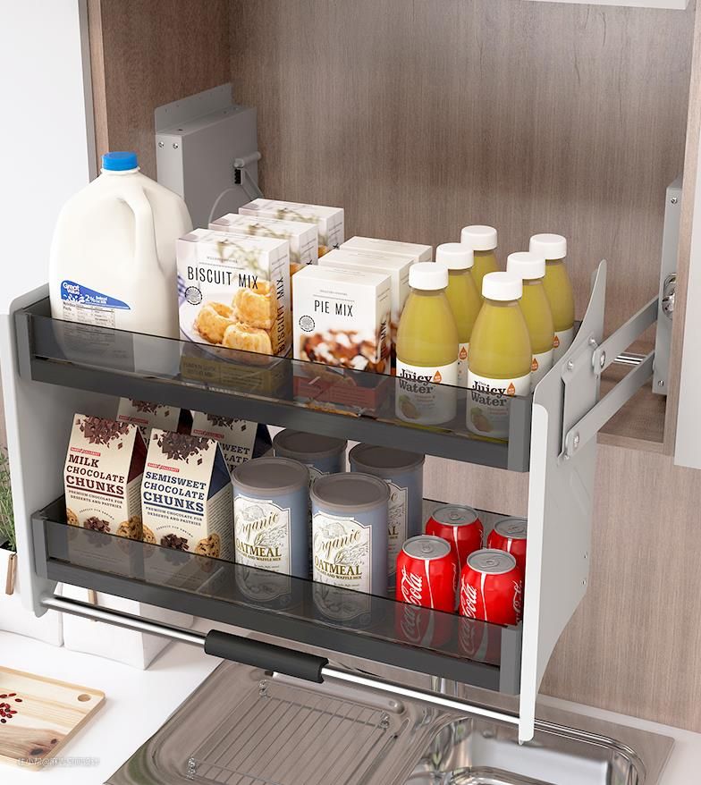 第三种则是费用较高的升降拉篮式,方便取放,而且吊柜的深度也可以适当增加,储物空间增大。