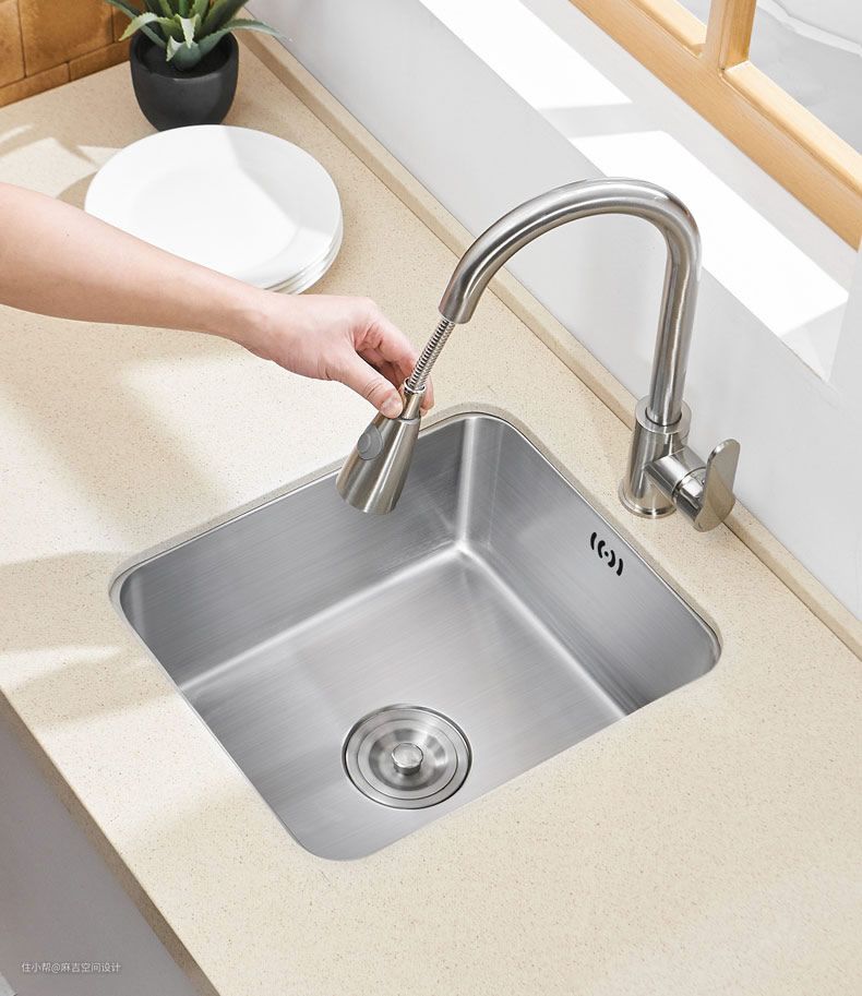 龙头的话选择可抽拉式长柄高抛龙头,在清洗时可以不受长度限制(传统龙头的长度只能固定在一个位置直冲),抽拉洗水时还能控制出水模式,避免喷溅等发生。