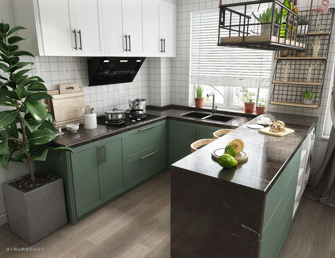U型:适合方正型厨房选择的布局,U型布局的储物功能非常强大,而且设置合理的情况下,烹饪区两侧可以更方便准备和入碟,既不干涉又能直观看到。岛型设计也在此列,中间空余空间足够的话,适用。