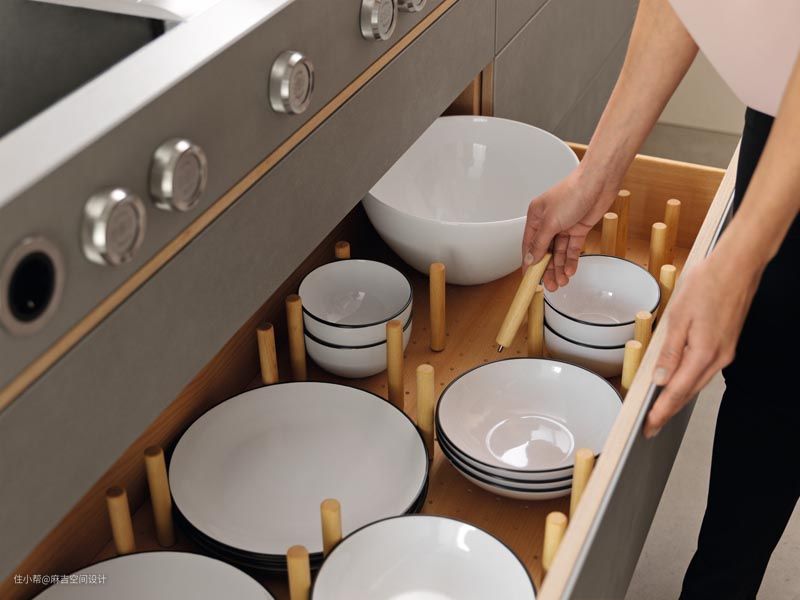 每层抽屉的高度不一,往下逐渐增宽。第一层为组合式抽屉,放置刀叉筷勺等基本操作类餐具,第二层为碗碟等常用置物类餐具,最后一层一般都是大件的锅壶放置。(根据各家厂商不同各有其详细的橱柜使用说明,抽屉参数等)