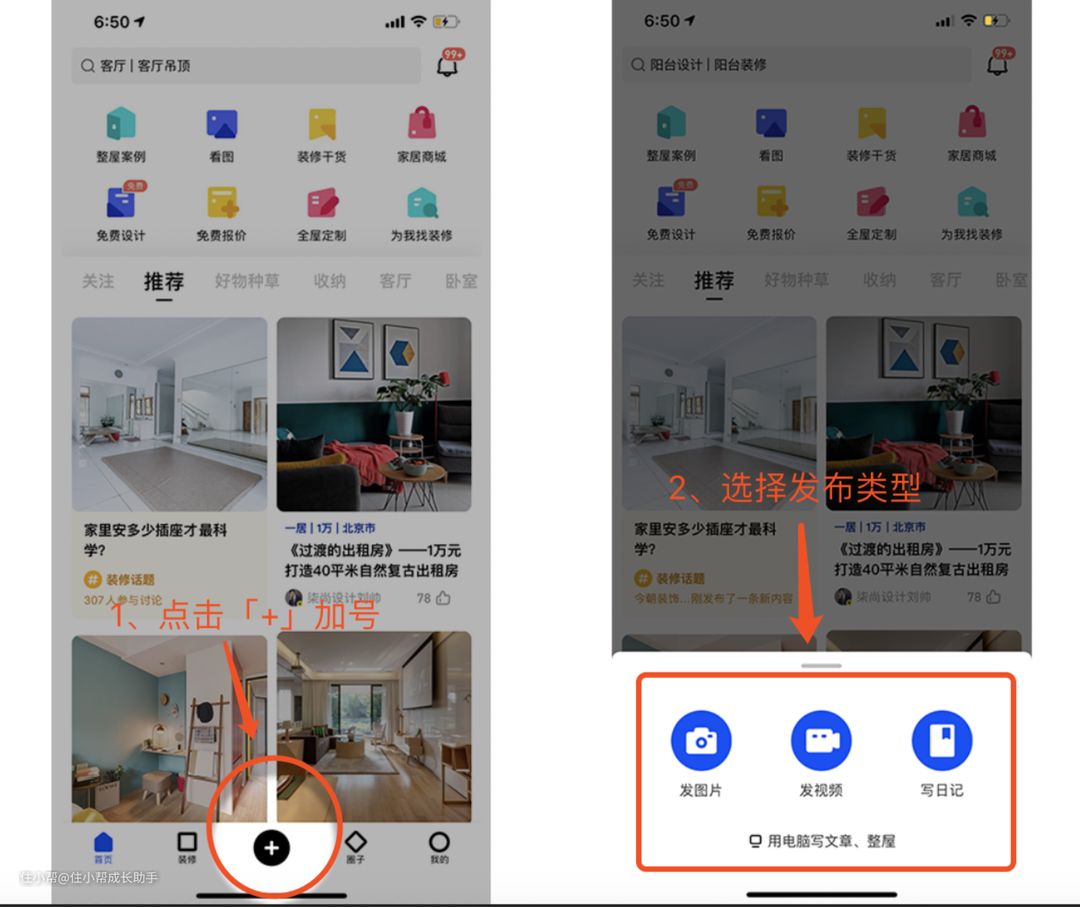 1)直接在住小帮APP发布,点击最下方「+」号,选择内容发布类型