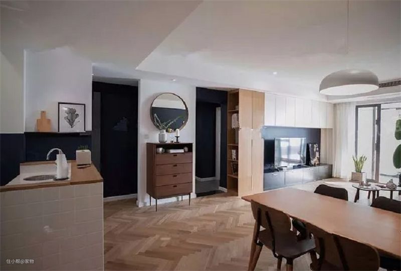 即使是北欧风,铺上人字形实木地板,也不会显突兀,有特色的同时,整体呈现出来的效果,远比铺地板砖要温馨的多,无论小户型还是大户型都可以尝试。