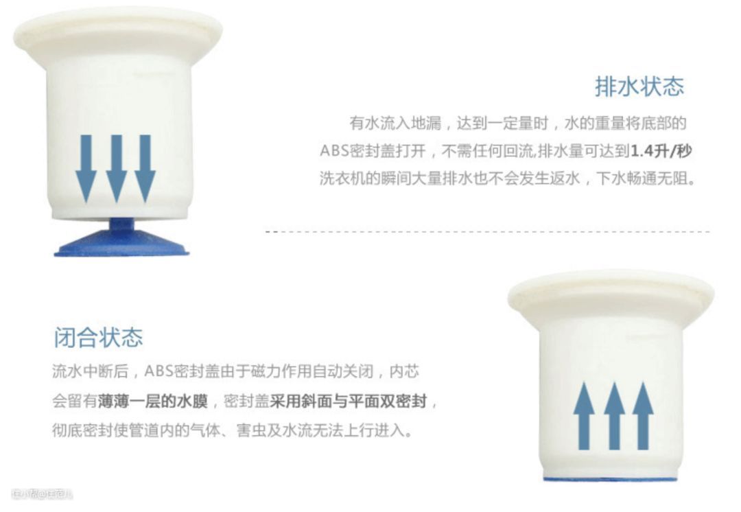 翻板地漏是底部有一个小板子(侧面连接),有水流时打开,无水流就靠重力作用合上。