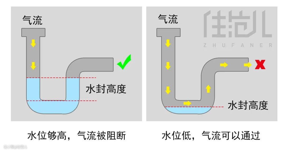 所以如果有长期不用的管道、地漏,记得暂时封上,或者经常定时注水进去,保证水封的高度。