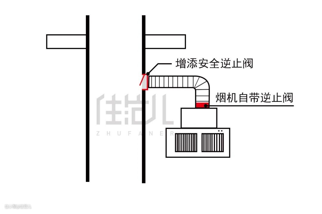 一般来说,油烟机接排风管的地方自带一个止逆阀,排风管接公共烟道的地方还应该装一个。