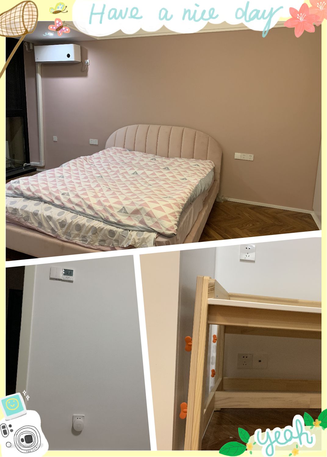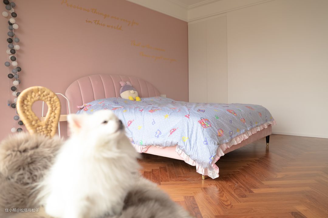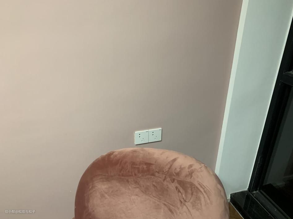 电视后方,用电视挡住了两个插座和一个AP面板,离地0.9米,挂上电视后清清爽爽。娱乐厅也是未来的父母房,粉色墙面预留的电位相距1.6米,未来可以摆放1.5宽的床,床头插座离地高度0.65米。