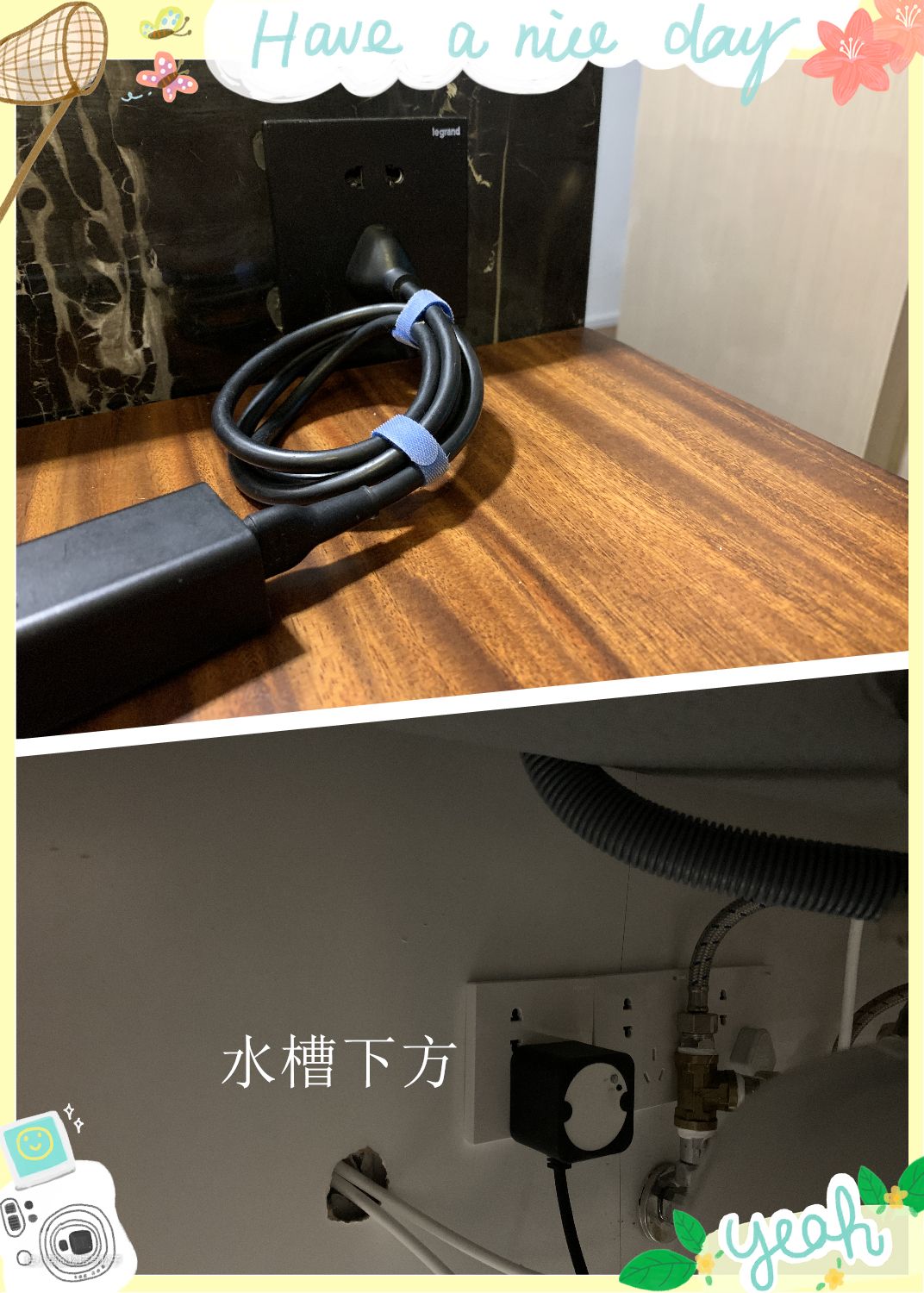 水槽柜里有三个插座,目前设备有垃圾处理器、ro机。