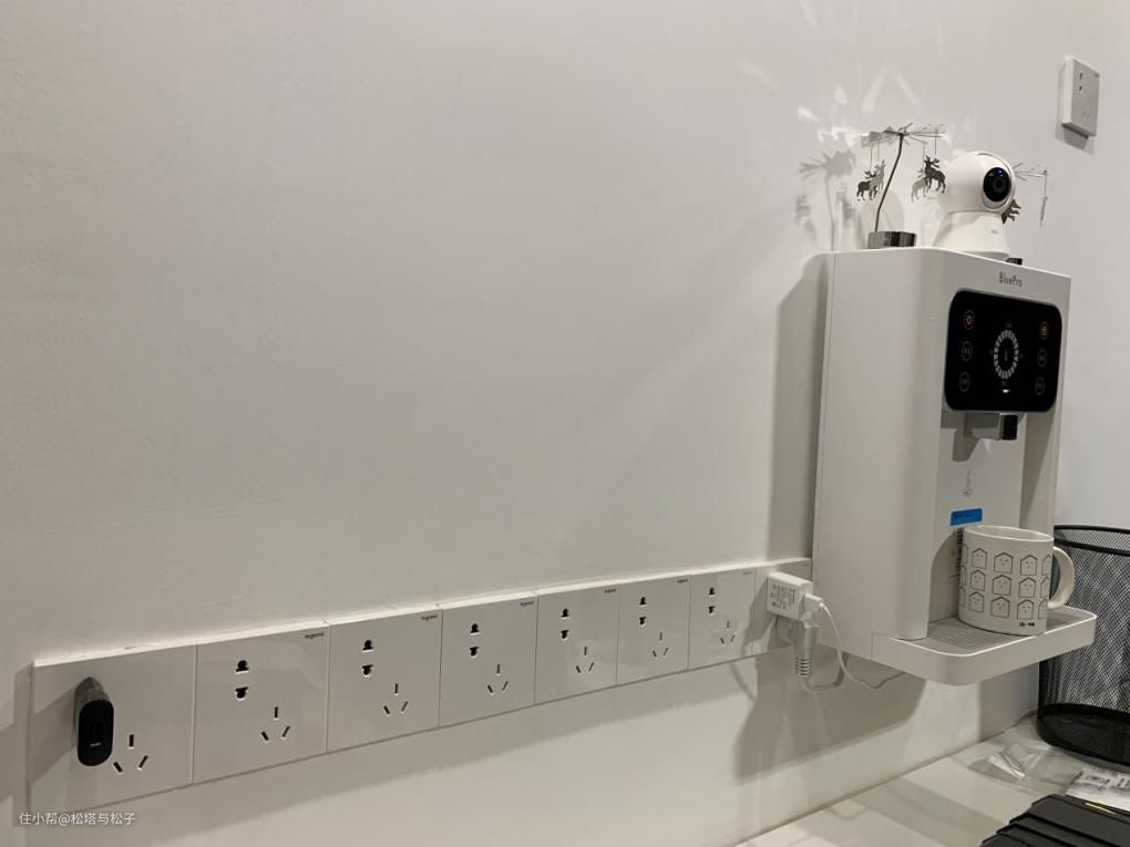 冰箱和洗碗机后方各有一个插座,台面上方为厨房小家电预留8个插座,离地1.3米,最右暗藏了净水管,用来安放管线机。