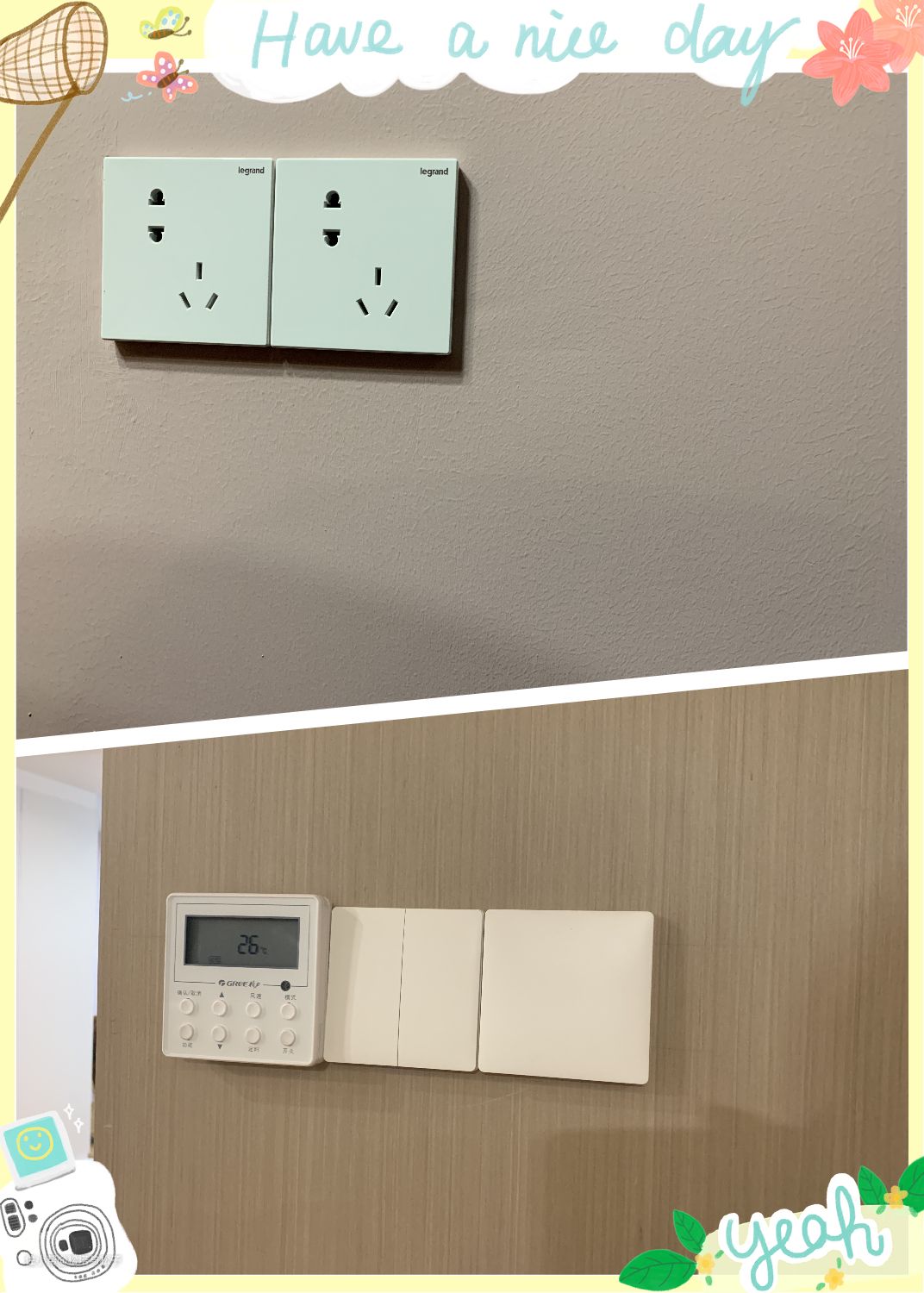 进入房间开关高度在1.4米处是刚刚好的,墙角的开关下方插座离地0.3米,用来放多功能网关。