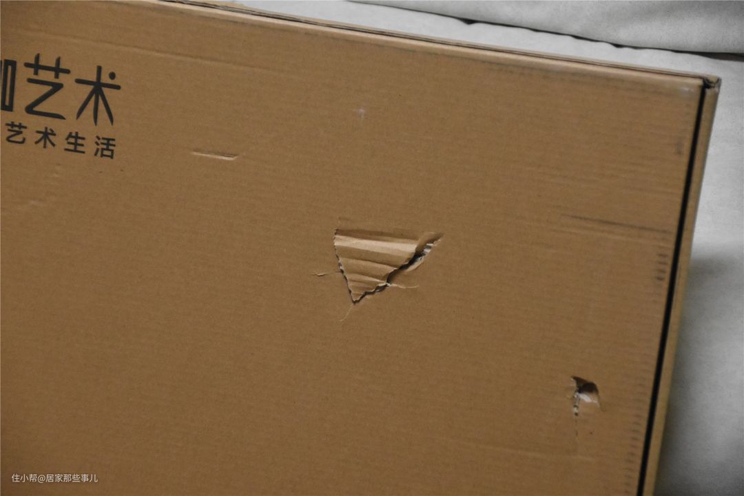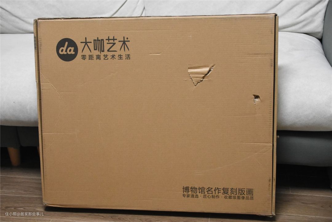 网上购买大尺寸的复刻画最怕的就是物流环节,因为尺寸比一般的快递要大,磕碰也是在所难免,京东快递的物流服务还是值得点赞的,不过快递小哥提前给我来了电话,转运中心卸车的时候发生了剐蹭,纸箱外面有个洞,不过里面没有坏,顿时紧张了。