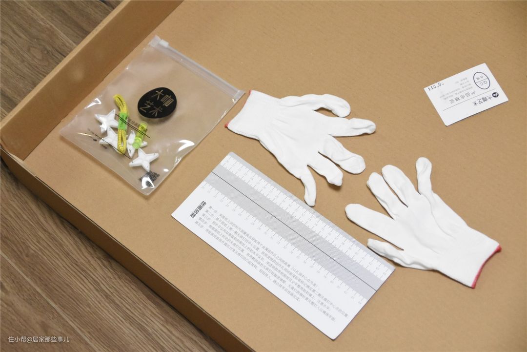 对于我来说画直线,挂相册这件事一点也不在行,好在包装中有水平尺和手套一系列的工具,配合无痕钉的安装,壁纸也不会留下痕迹,敲敲打打下次还能用。