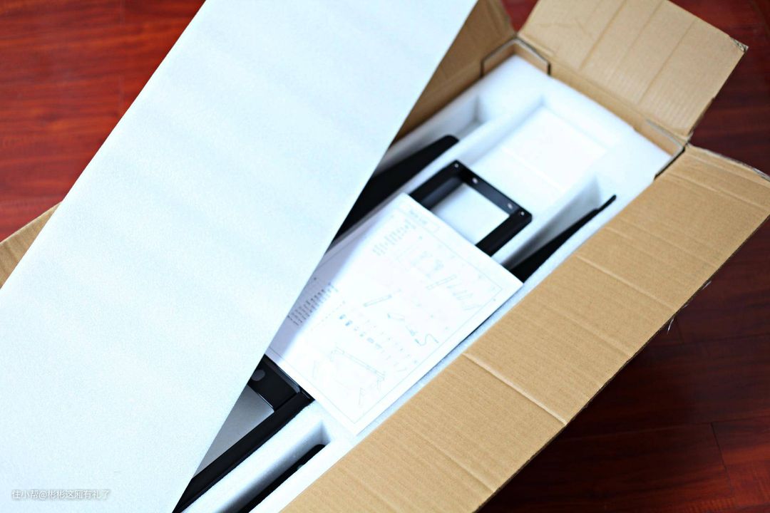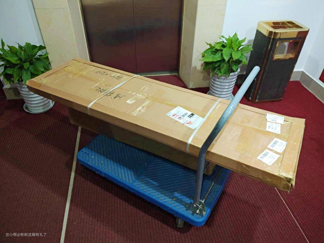 ▲我选的是尺寸最大的,宽1.5米的浅胡桃色。包裹真是大呀!没有小推车,真的搬不进家门。不过店铺是包送货入户并安装的,主要是我们小区管理比较变态,快递不能进小区门,但从防疫的角度来说,还是有好处的。桌板和架子分开两个箱子,箱子装都包装得很好。看了一下桌板两大块儿,差不多大小,只有两个大的通线孔。桌板不是实木的,而是密度板,重量其实比实木还有分量,感觉质量应该不错,另外没有什么刺鼻气味。