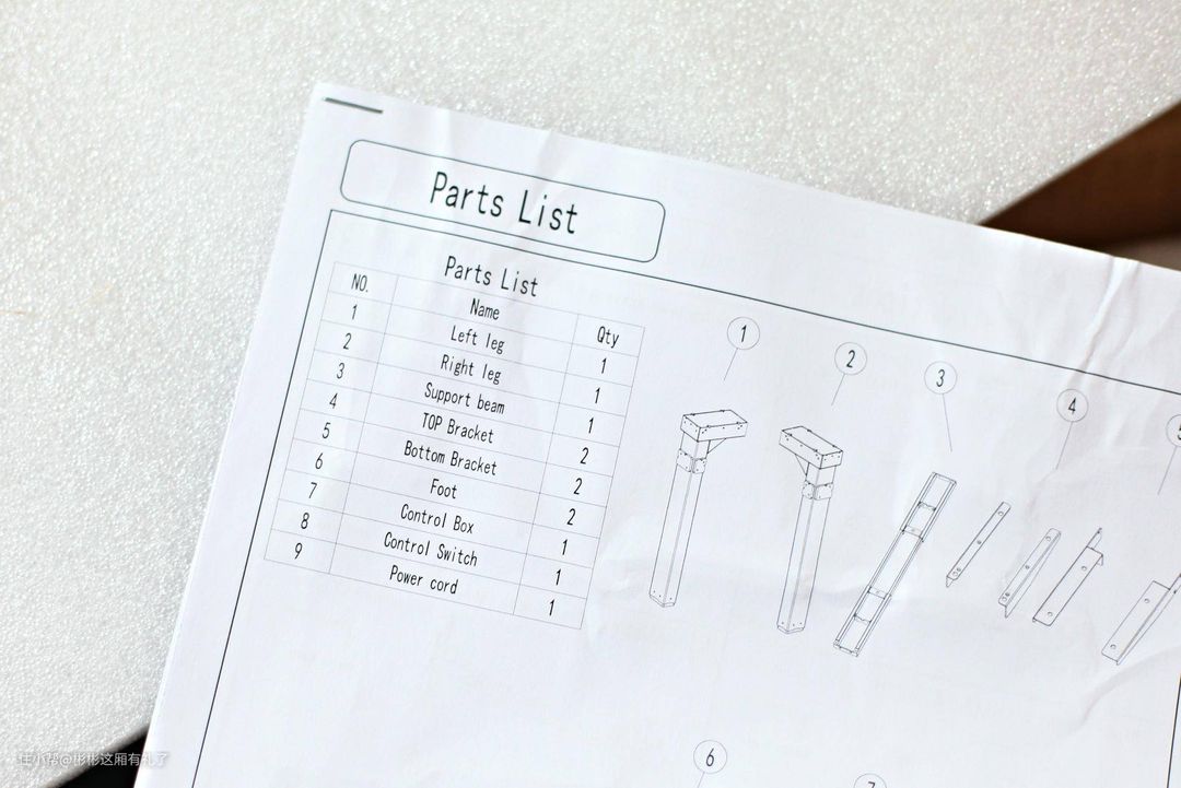 ▲来拍一个全家福。这张全家福可真是够大的,大家可以看到有两个L字形的升降机,也是桌子的主要支柱,以及一根很粗大的横梁、两根脚架以及四根和桌面连接的金属托架。螺丝和胶垫也是分门别类,装在不同的袋子里,看起来还是蛮有秩序的。