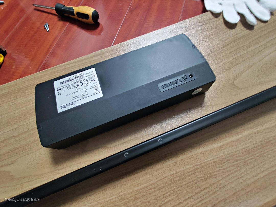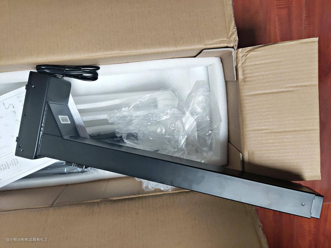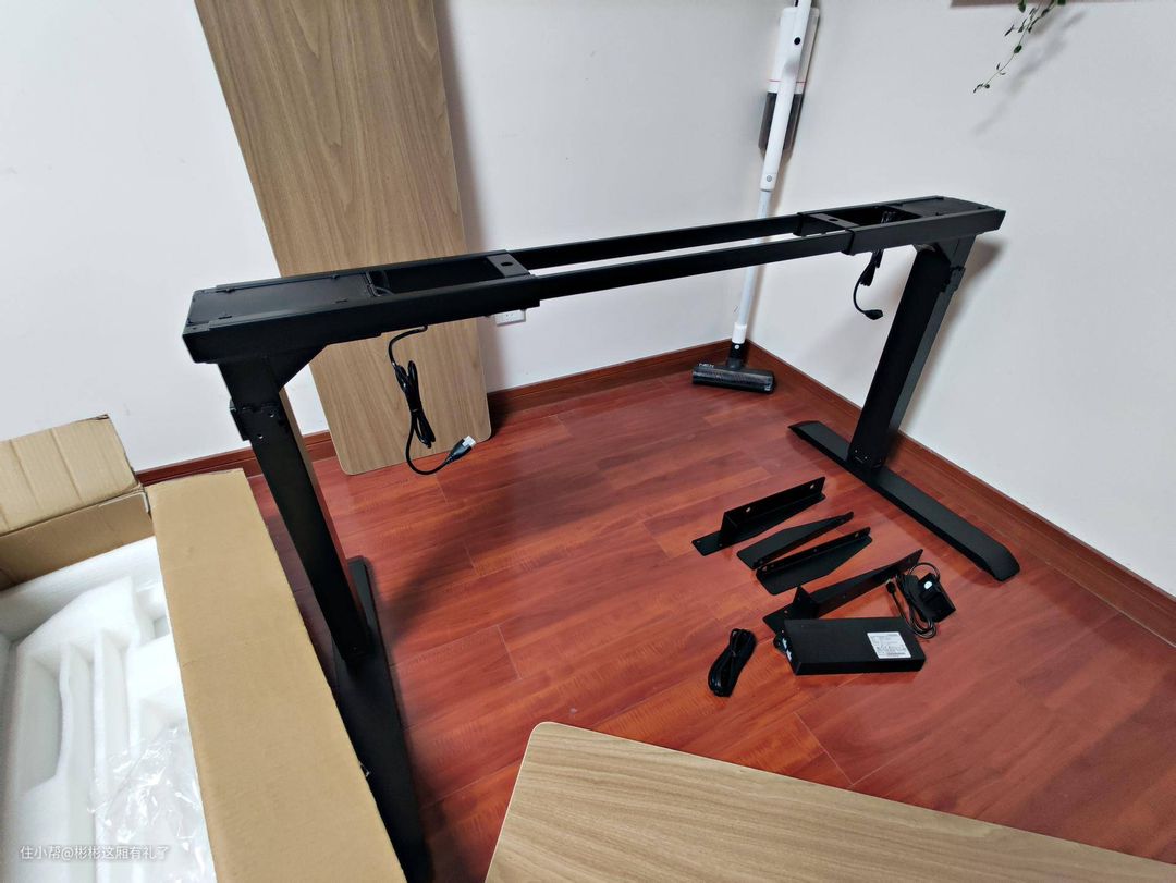▲升降机和桌子框架在另外一个箱子里。可是真是重啊!全部都是厚厚的金属,不沉是不可能的。量了可以看到的金属厚度,足足有三毫米那么厚。所以用料还是很良心的!桌子两边各有一个升降架,里边还有一个高功率电机,肉眼看不到。电机和电源盒全套都是台湾产Timotion的,购买这款桌子其中一个比较重要的原因也是它的动力系统采用Timotion系统,在国外时看到的升降桌运用的也是这套系统,评价不错。所以这次更换看到是Timotion系统也比较放心下手了。