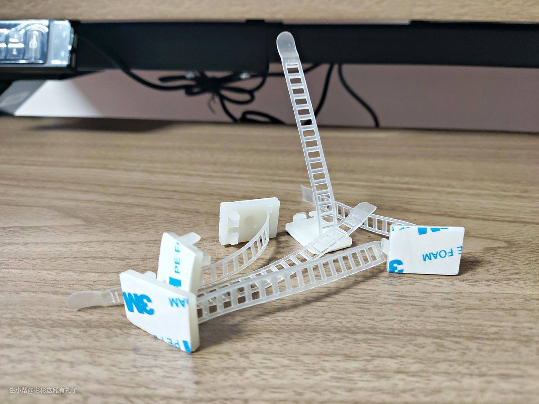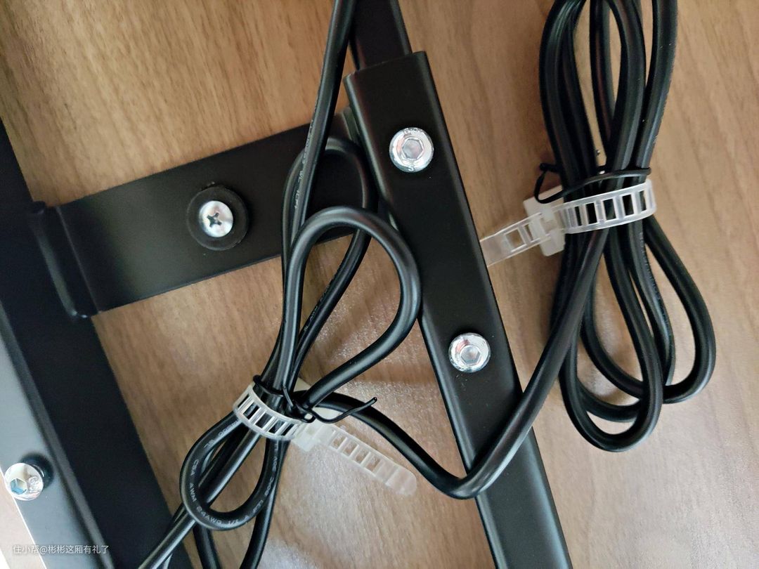 ▲最后就是安装下层的金属托架和桌板了,将桌板固定住,这个步骤真的很费劲,而且是弓着腰从下往上钻螺丝。桌子安装好之后,把几根控制线固定一下就好了。话说配的几根收纳线很好用,有3m双面胶,可以固定在桌子底下。