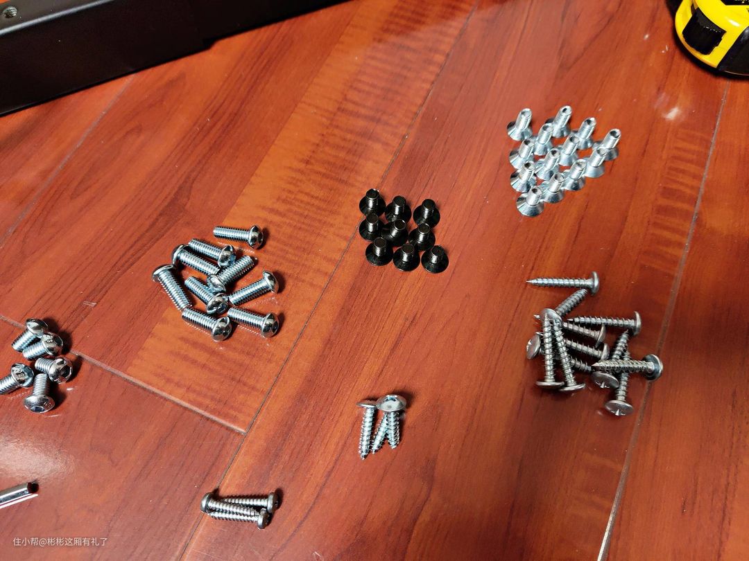 ▲第四步就是将上层桌板固定住了,这一步个人觉得难度很大。因为板子上没有预设的孔位,只能自己摸索,大致确定横梁的位置之后就在孔上拧上螺丝。因为板材实在是太厚实了,很硬!螺丝很费劲才拧进去,螺丝刀尾都把手掌心的皮给磨破了!后面不得不戴上手套,真是要了老命啊!所以墙裂建议出厂的时候,将螺丝的孔位画出来,或者是钻几个小孔。如果家里边有电钻的话,可以用小口径的电钻钻几个小孔,这样安装的时候会省很多力。