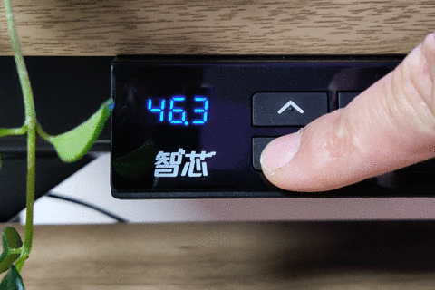 当然智芯这个电脑桌最关键或者是核心的功能,就是升降,可以调节桌面的高度。这个功能是其他一般的电脑桌所没有的,桌面高度最低可以调到69公分,最高可以调到一米15公分。整个跨度将近半米了,可以适应不同的身高和需求。上面两张图是手动挡,也就是按上下键来手动调节桌面的高度。ps,电机运行声音很小,几乎不会引起注意。
