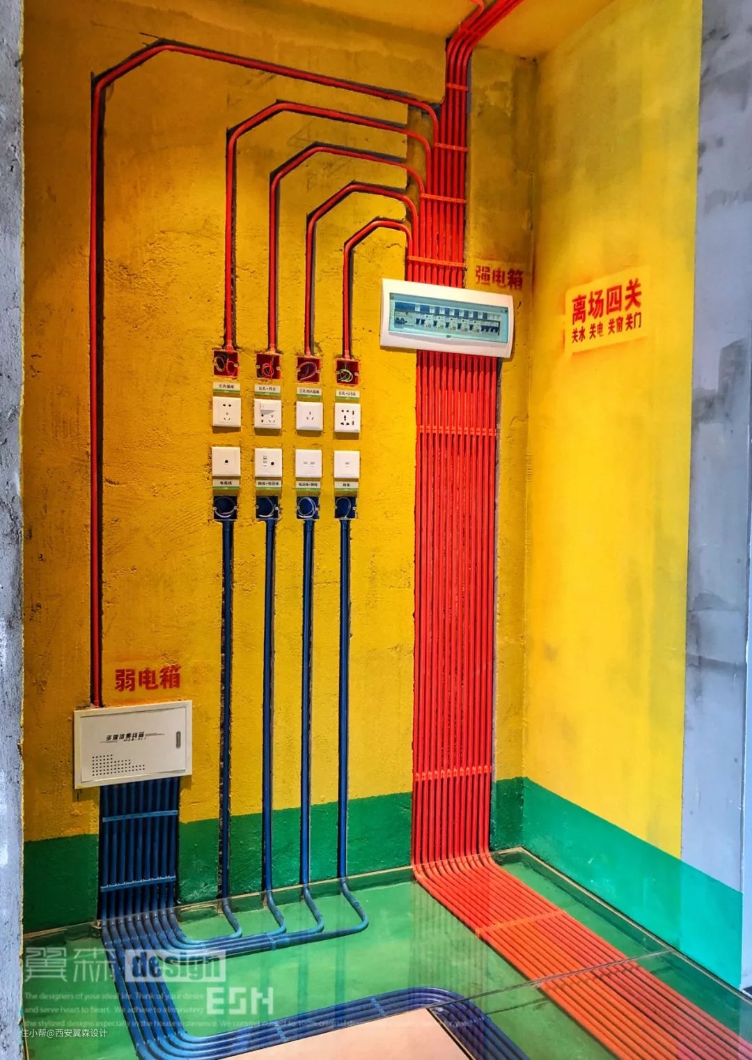 ▲红色强电,蓝色弱电。开槽横平竖直,各类型号的插线板,在样板间也均有展示。
