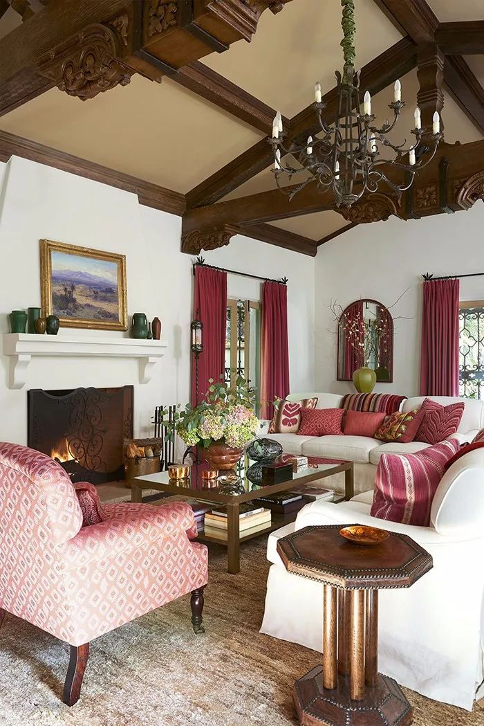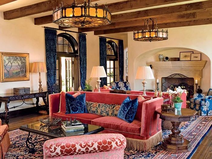 这是位于洛杉矶的一座西班牙殖民风格的住宅,他的外部是石膏外墙,粘土制成的屋顶瓦片。而在内部,房子保留了许多原有的特色,从手工雕刻的天花板横梁到锻铁吊灯和拱形门。而家居的配色,从红色和绿色的鲜艳色调过度到更加戏剧性的色调,如古典而朴实的洛可可红色。