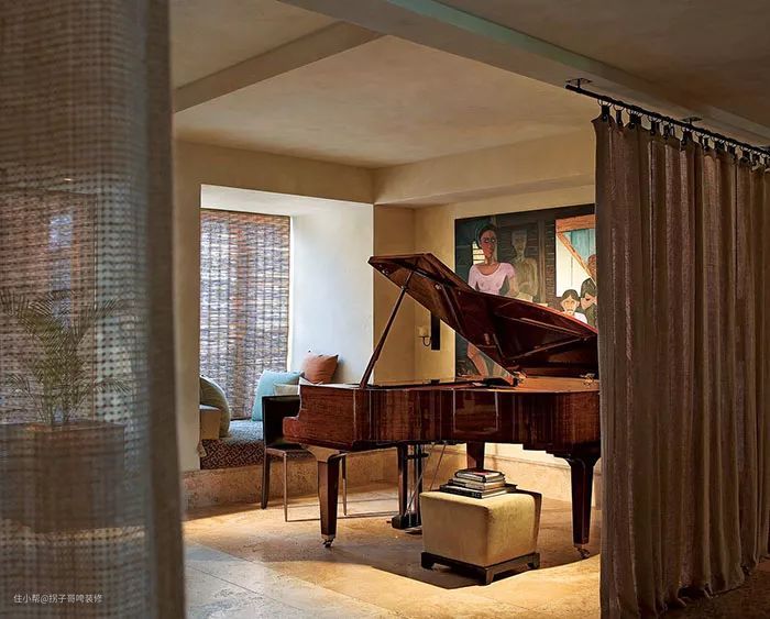 设计师使用了旧木梁,主要用在主卧室和其他几个房间的天花板上,形成了具有金字塔形的天花板样式。设计师还为住宅挑选了几件古董,其中一间客房使用了一个19世纪的皮革行李箱。这座房子本身很现代,但是又参考了西班牙殖民风格。窗帘来自bam-boo品牌,混凝土墙用浅灰褐色石膏抹平,形成了一个漂亮的斑驳表面,房子里柔和色调带来宁静的感觉,客厅里铺着凸显自然感觉的剑麻地毯。