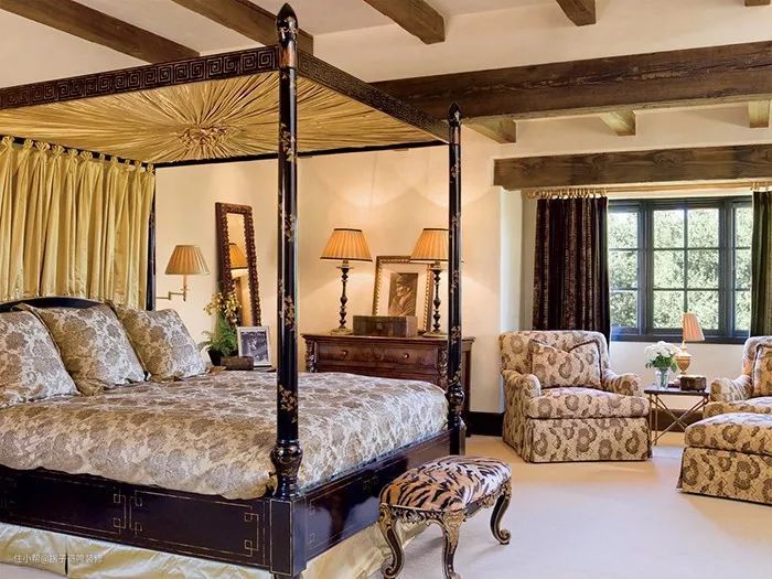 在主卧室,四柱床和边几是西班牙古典家具,床单由Sferra设计,1900年的波斯地毯来自Doris Leslie Blau。