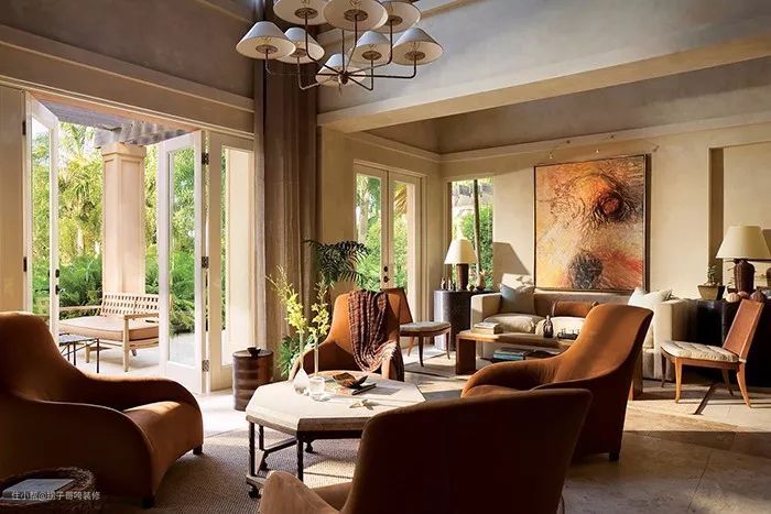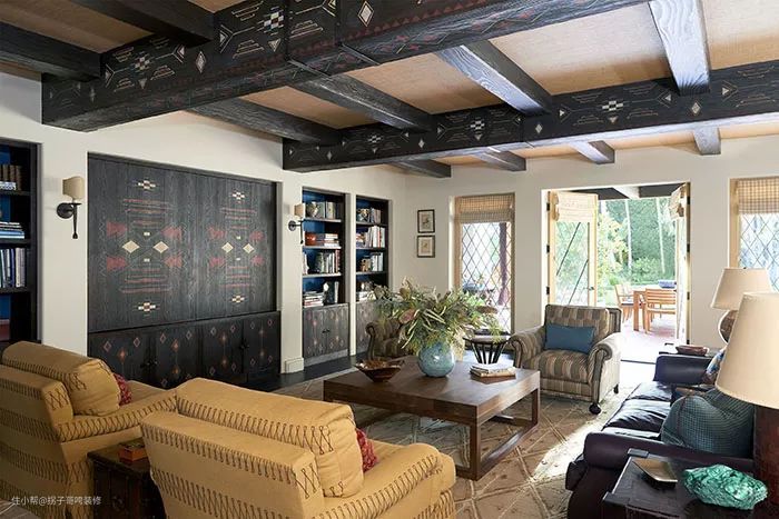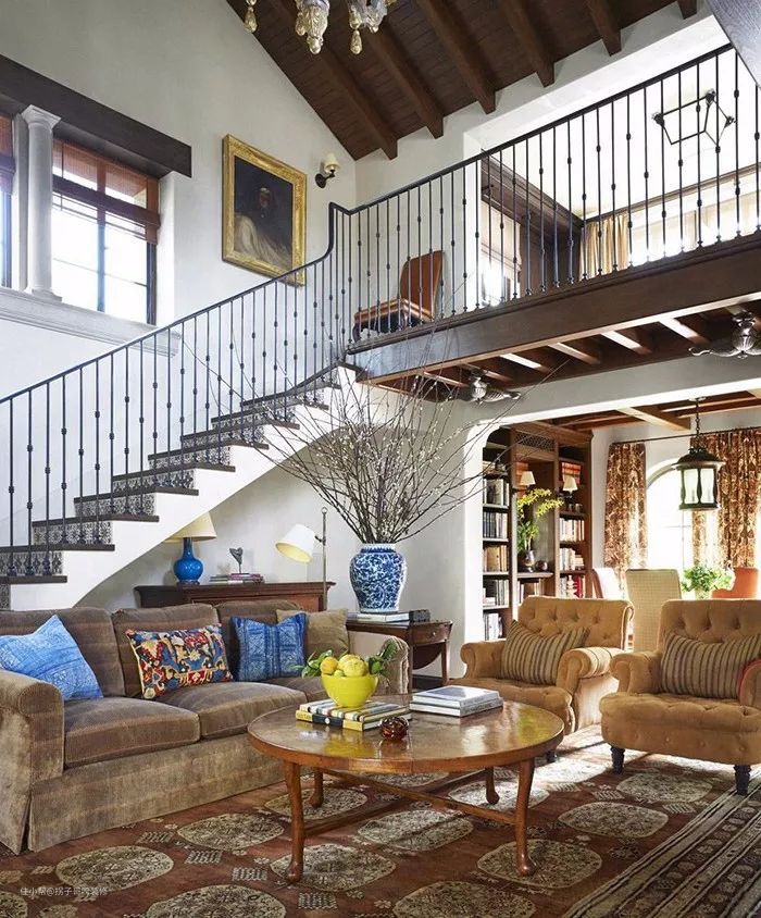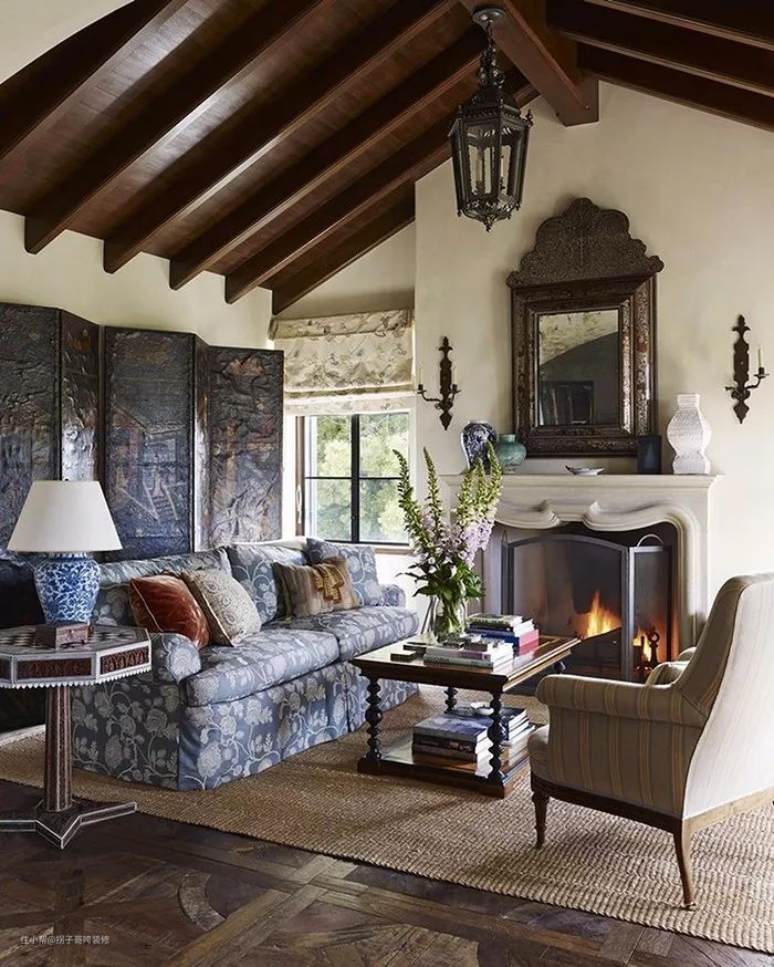 这座房子是位于南美洲的西班牙殖民风格,灵感来自18世纪和19世纪的哥伦比亚住宅,这些住宅也围绕着庭院而建。这里的西班牙殖民风格,细节更少,木材更多,为了进一步提升温馨舒适的感觉,设计师通过选择天鹅绒布料、古典波斯地毯,英国和意大利古董,定制吊灯和壁炉,最终形成了一个有别于传统牧场,更为精致的欧洲家居。